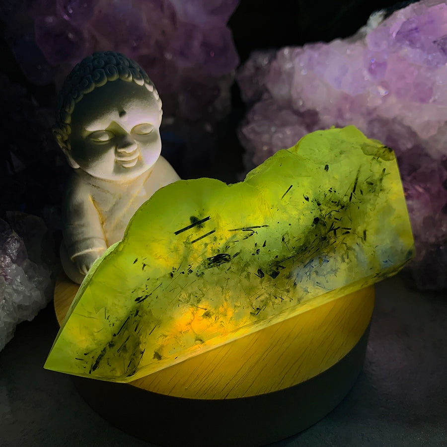 Introducing the "Crystal Mood Light Base + Prehnite with Tourmaline Point". This enchanting set combines the power of crystal light and the intrigue of Prehnite with Tourmaline Point, creating a captivating dance that reveals the hidden beauty and enchanting energies of these precious gemstones.
